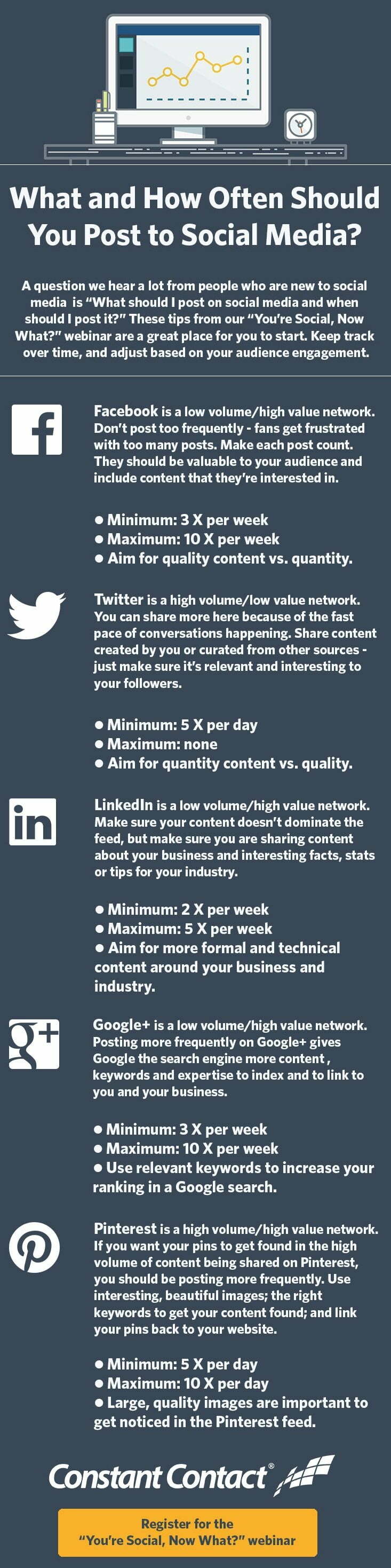 Източник: http://www.digitalinformationworld.com/2014/07/how-often-should-you-post-to-social-media-infographic.html